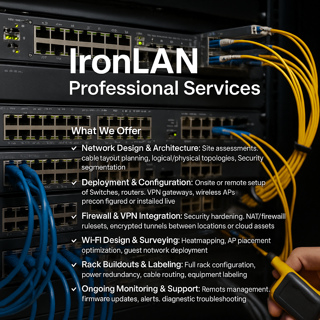 IronLAN Services IronLAN Professional ServicesIronLAN delivers more than just network hardware—we provide end-to-end services to help you plan, deploy, and manage robust network infrastructure built for long-term success. Whether you're building out a new facility, upgrading legacy equipment, or expanding to multiple sites, our engineering team is here to help every step of the way. What We Offer